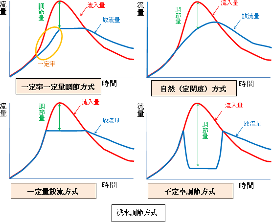 | 調節池 | 下流の河道が洪水を流しきれない場合に、洪水の一部を河道内のある箇所に一時的に貯め、下流側の氾濫を防ぐことを目的とするものをいいます。 (同様の目的を持つ池で、市街地に設けられるものを「調整池」と呼びます。) |